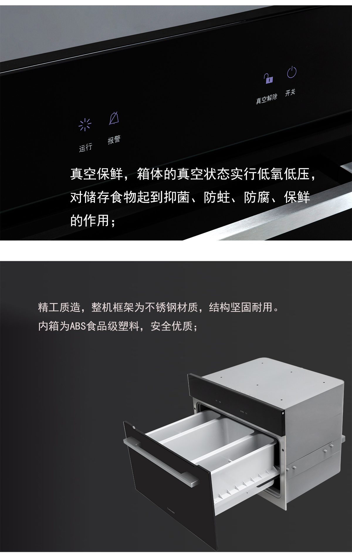 黑色鋼化玻璃面板;低氧低壓,真空保鮮;內箱為ABS食品級塑料;