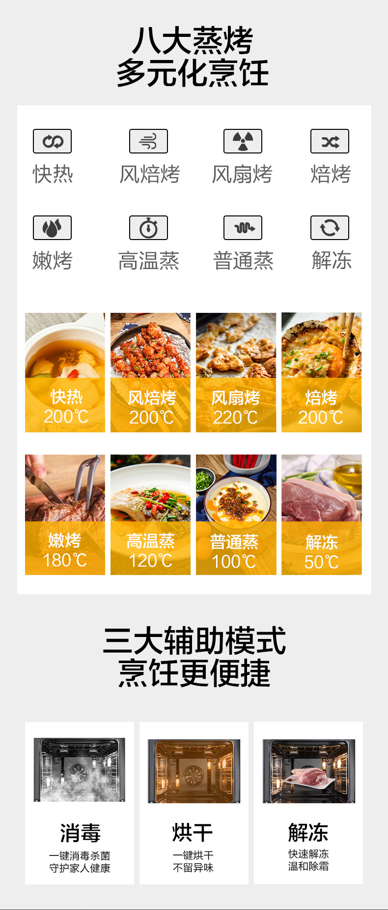 蒸烤消一體;360°均衡加熱,精準控溫;80L大容量;