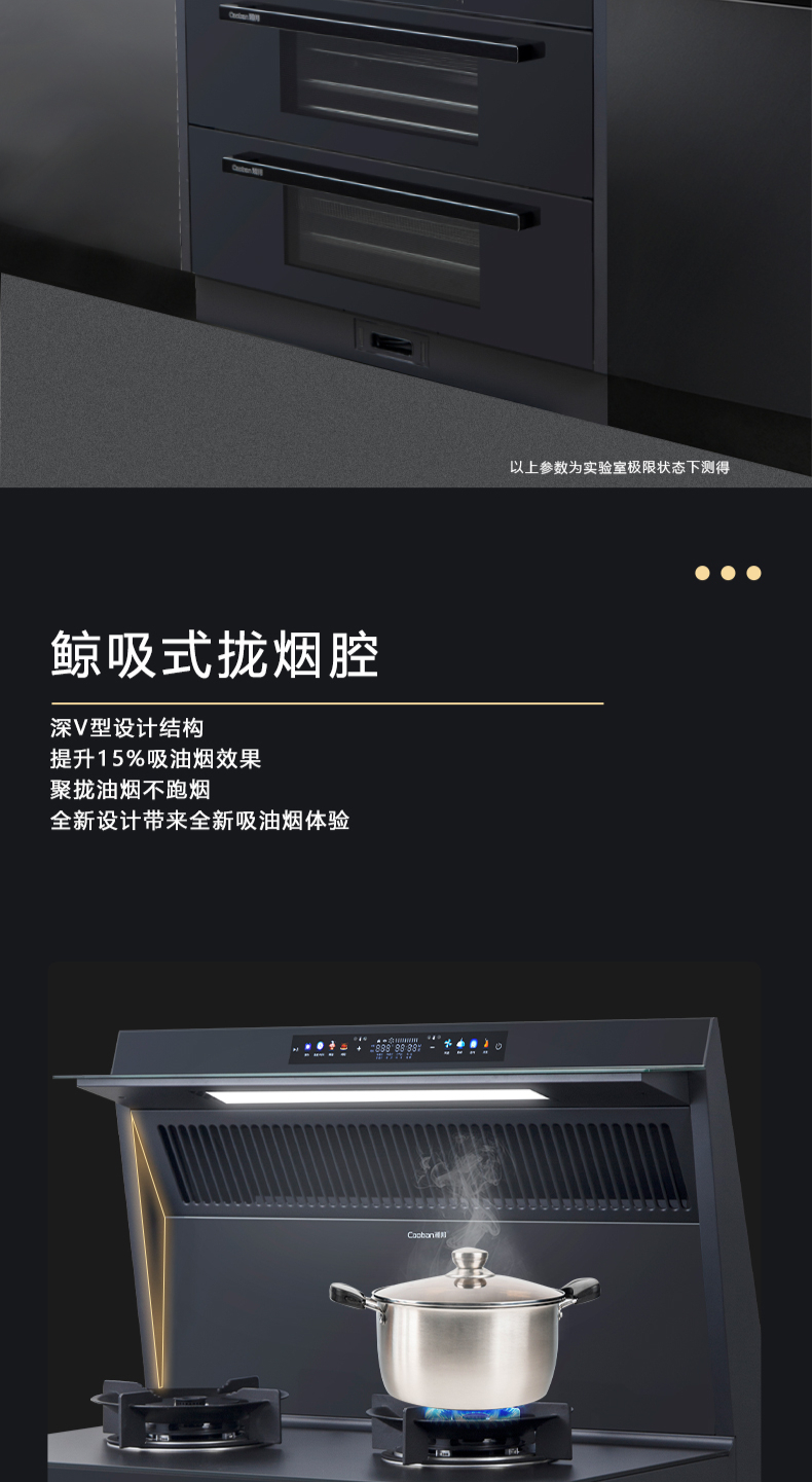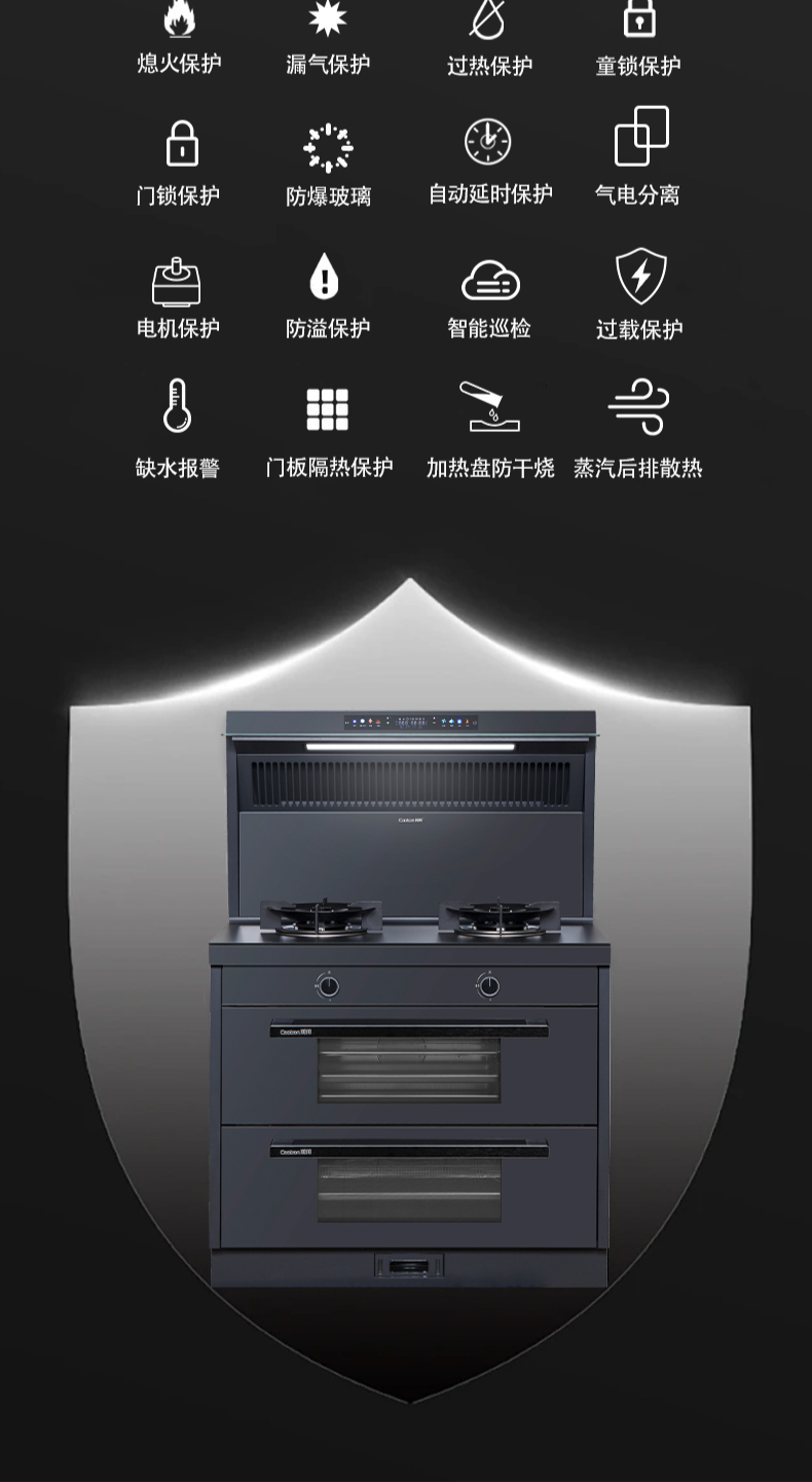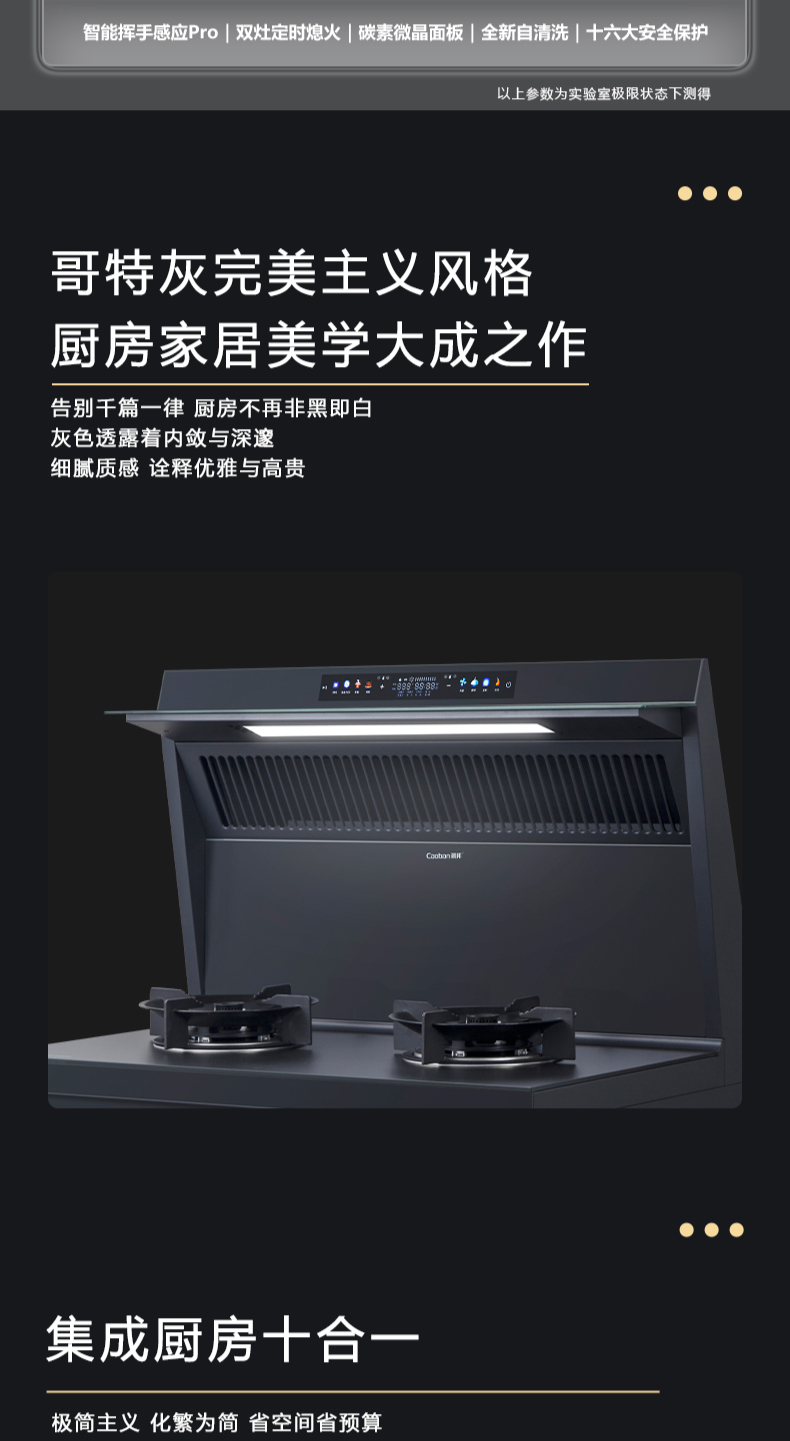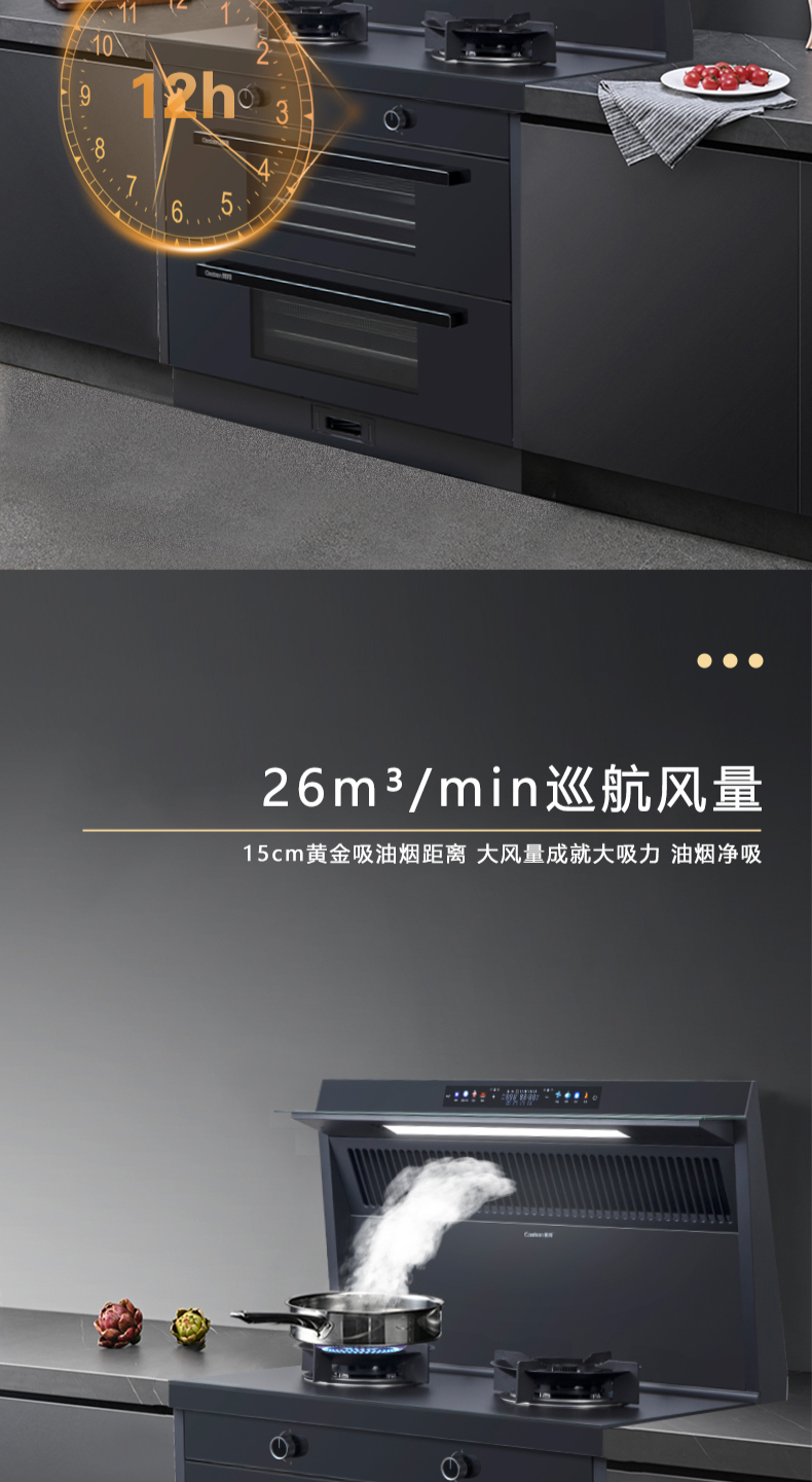 26方巡航風量,上蒸下烤新體驗,Cooking2 0智能彩屏,智能揮手感應Pro,雙灶定時熄火,碳素微晶面板,全新自清洗,十六大安全保護